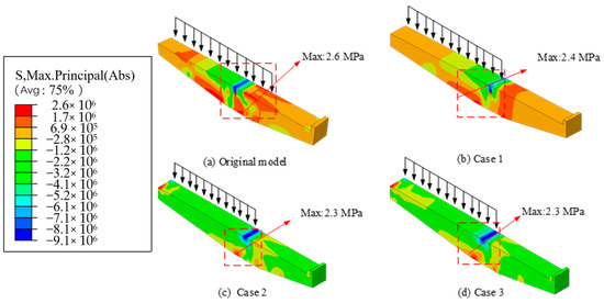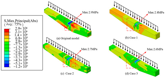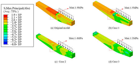 Figure 16, Figure 17 and Figure 18 display the stress distribution of both the original and optimized cantilever beams with prestressed rebars under the following three loading conditions: external eccentric load, internal eccentric load, and full load. Figure 16 illustrates the impact of prestressed rebars on the stress distribution under external eccentric loading. The addition of prestressed rebars significantly reduces the tensile stress at the top of the inner side of the beam and the beam–column joint. In Case 1, where prestressed rebars are placed only on the inner side of the beam, the maximum stress is reduced to 1.5 MPa (Figure 16b), although stress concentration remains, particularly at the top of the beam–column joint. In Cases 2 and 3, where rebars are added to both the inner and outer top surfaces, the stress concentration is notably decreased, with the maximum stress values dropping to 1.4 MPa (Figure 16c) and 1.3 MPa (Figure 16d), respectively. This demonstrates that positioning prestressed rebars on both the inner and outer top surfaces significantly reduces stress concentration, thereby improving the bending and shear resistance of the cantilever beam under external eccentric loading.