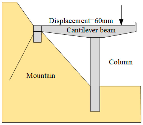 The incorporation of prestressed rebars and the application of prestressing have a substantial effect on the load-bearing capacity of cantilever structures [57,58,59]. To fully assess the performance of the optimized cantilever structure, further simulation analysis of its load-bearing capacity was conducted. As illustrated in Figure 19, a displacement control method was employed to apply a downward vertical displacement at the most unfavorable position of the entire structure. This method facilitates the investigation of the load-bearing capacity and overall stability of the structure under various optimization scenarios.