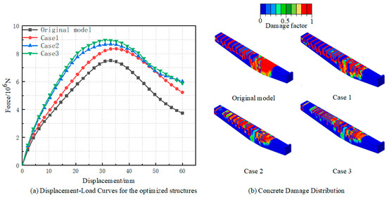 Figure 20 presents the displacement-load curves and final damage distribution for both the original and optimized cantilever structures. As shown in Figure 20a, during the initial loading phase, the original model exhibits the smallest slope, reflecting its lowest initial stiffness. With the addition of prestressed rebars, the initial stiffness of Cases 1, 2, and 3 gradually increases. Notably, Cases 2 and 3 demonstrate significantly higher initial stiffness compared to both the original model and Case 1, emphasizing the positive effect of prestressed rebars on the overall stiffness of the structure. Regarding peak load, the original model has the lowest capacity, while the optimized models show progressive improvements, with Case 3 achieving the highest peak load, indicating a substantial enhancement in load-bearing capacity. Finally, the analysis of the descending segment reveals that the original model’s load-bearing capacity declines the fastest, while the optimized models exhibit a more gradual reduction. Cases 2 and 3, which have the lowest descending segments, suggest that the optimized structures offer superior ductility. The damage distribution shown in Figure 20b reveals that, in the original model, damage is primarily concentrated at the upper part of the inner beam and the beam–column joint. In Case 1, the prestressed rebars placed at the upper inner side of the beam significantly alleviate damage at the beam–column joint, demonstrating the effectiveness of prestressed rebars in mitigating stress concentration and enhancing the overall structural integrity. In Cases 2 and 3, a further reduction in the damage of the beam–column joint is observed, indicating that placing prestressed rebars on both the inner and outer sides of the beam effectively reduces damage at this critical junction, improves stress distribution, and prevents the propagation of damage. In summary, the analysis demonstrates that placing prestressed rebars at the top of the cantilever beam significantly enhances the overall structural stiffness, peak load capacity, and ductility, while also delaying the onset of structural damage. This optimization leads to a more balanced stress distribution, thereby playing a vital role in improving the stability and safety of the structure.