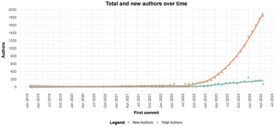 This figure illustrates the growth in the total number of authors and the introduction of new authors over time. The x-axis represents the timeline from January 2019 to June 2024, with monthly intervals. The y-axis indicates the number of authors. The orange line depicts the ‘Total Authors’, representing the cumulative number of contributors. The green line shows ‘New Authors’, indicating the number of authors making their first contribution within each month.