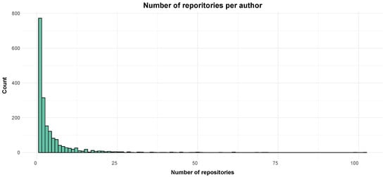 This figure displays the distribution of the number of repositories (models) contributed by each author. The x-axis represents the number of repositories, ranging from 0 to 100. The y-axis, labeled ‘Count’, indicates the number of authors who have contributed the corresponding number of repositories.