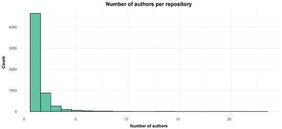 This figure presents the distribution of the number of authors contributing to each repository. The x-axis represents the number of authors, ranging from 0 to 20. The y-axis, labeled ‘Count’, indicates the number of repositories that have the corresponding number of authors. The data are displayed as a histogram, illustrating the frequency of repositories based on the number of authors contributing to them.