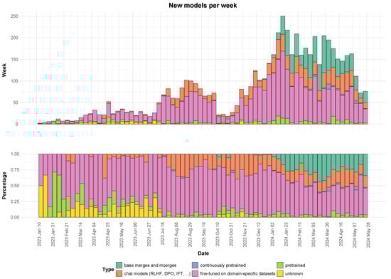 This figure presents the weekly production of new models, categorized by type, from January 2023 to May 2024. The upper panel displays the absolute number of models released each week, with the y-axis labeled ‘Week’ representing the count of models. The lower panel shows the proportional distribution of these model types as a stacked area chart, with the y-axis labeled ‘Percentage’ representing the proportion of each type. The x-axis in both panels represents the ‘Date’, showing the progression of weeks. Bars are color-coded based on type. The stacked area chart in the lower panel illustrates the changing composition of model releases over time, highlighting the relative contributions of each type.