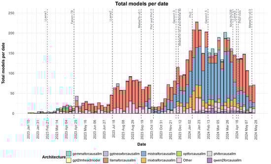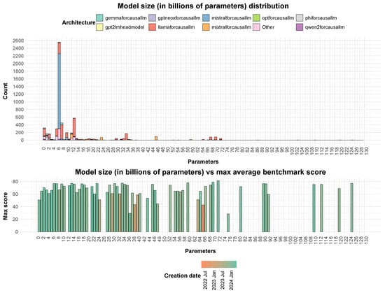 Being at the top of the leaderboard is often highlighted, but it does not tell the whole story. Models of various sizes occupy positions across the leaderboard, with many impressive achievements found in the lower ranks of the absolute benchmark scores. Therefore, the impact of model size on its popularity was examined next. Figure 8 illustrates the distribution of models based on the number of parameters, with bars colour-coded according to model architecture. The data suggests that most of the models have less than twenty billion parameters, which indicates that smaller models are favored. This pattern could be attributed to the users’ ability to run the models on local machines, as well as the ease of adapting them using free resources provided by services like Google Colab [] and Kaggle []. Although a limited number of models exceed 100 billion parameters, they would not be visible on the histogram because of the substantial quantity of models with fewer than 20 billion parameters.