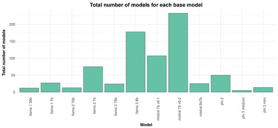 This figure presents the total count of distinct models derived from each specified base model. The x-axis, labeled ‘Model’, lists the base models considered, including various ‘llama’, ‘mistral’, ‘mixtral’, and ‘phi’ models. The y-axis, labeled ‘Total number of models’, represents the cumulative count of models generated from each base model. The data are displayed as a bar chart, with the height of each bar indicating the number of derived models for the corresponding base model.