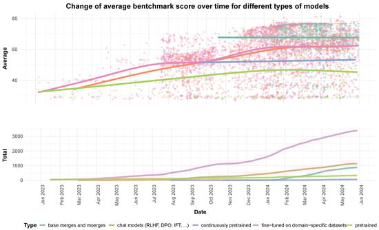 It is important to note that an increase in the number of models on the platform does not necessarily indicate progress, but rather an increase in popularity. After examining the distribution of various model types, we attempted to assess their performance over time, based on the average score across the six benchmarks stated in the methodology. This is depicted in Figure 7, which presents two aspects. The first aspect is the change in the average benchmark score for each model type over time. The individual dots denote the performance of a specific model, and a smooth line was added to indicate the average performance of the group that the model belongs to at a given time, making it easier to observe the temporal variations for a specific model type. It is evident that most categories improved their benchmark scores over time. Currently, the majority of the dots are clustered in the upper section of the y-axis, within an accuracy range of 60 to 80 percent. The smoothed results exhibit a similar trend. However, the one exception is the ’base mergers and mergers’ category, which failed to achieve a significant rise in score. This may be due to its relatively recent introduction and its initial high position compared to others.
