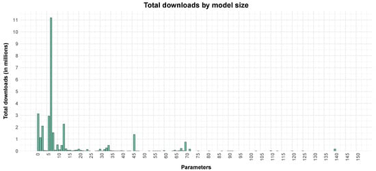 This figure displays the total number of downloads (in millions) for models across varying parameter sizes. The x-axis represents the parameter size, while the y-axis shows the total downloads in millions. This chart illustrates the distribution of download popularity relative to model size.