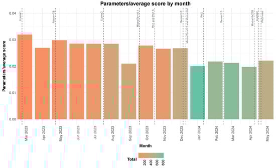 This figure illustrates the relationship between parameters and average score over time. The x-axis represents the month, and the y-axis represents the ratio of parameters to average score. Bars are annotated with specific model releases. This chart depicts the change in parameters/average score over time, highlighting key model releases.