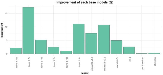 This figure displays the percentage improvement of each base model. The x-axis lists the base models, and the y-axis represents the percentage improvement. This chart illustrates the relative performance improvement across different base models.