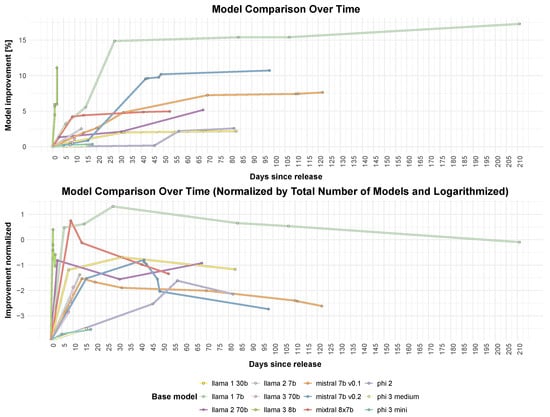 This figure displays the evolution of model improvement over time for popular base models. The upper panel shows the raw percentage improvement, while the lower panel shows the improvement normalized by the total number of models and logarithmized. The x-axis in both panels represents days since release. This figure compares the improvement trends of various base models over time.