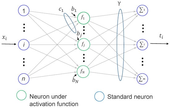 ELM networks were proposed by Huang for the training of single-hidden-layer feedforward neural networks (SLFNs). In ELM, the hidden nodes are initialized randomly, then trained without iterative methods. The weights and hidden neuron biases are randomly assigned, while the output weights are determined using the Moore–Penrose pseudoinverse under the least squares criterion [15]. In ELM, the hidden nodes (or neurons) may or may not be of the same size. The only parameters that need to be learned are the connections (or weights) between the hidden layer and the output layer. Consequently, ELM is formulated as a linear model. In comparison with traditional learning methods such as SVM, CNNs, etc., ELM is notably efficient and tends to achieve a globally optimal solution. Field studies have proven that even with randomly generated hidden nodes, ELM retains the universal approximation capability of SLFNs [16,17].