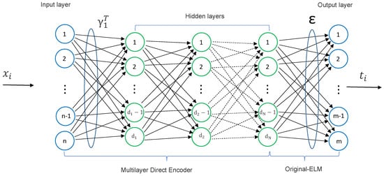 where represents the outputs of the hidden layer of the ELM-AE, denotes the operator associated with the generalized Moore–Penrose inverse of a matrix, and corresponds to both input and output data of the ELM-AE (unsupervised training. Additionally, N denotes the number of hidden nodes. The output weights of the ELM-AE are specifically designed to effectively extract features (or entities) from the input data by leveraging singular values. The parameter of regularization (C) is excluded in ELM-AEs for simplicity.
