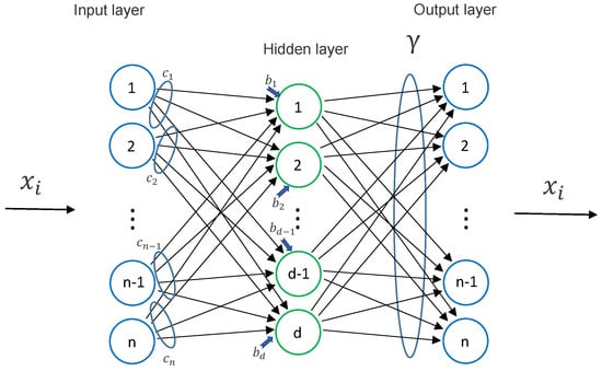 An ELM-AE can be conceptualized as a neural network comprising an input layer, a hidden layer, and an output layer (see Figure 3). It is characterized by having a number (n) of neurons in the input layer, d neurons in the hidden layer, and n neurons in the output layer and employing a nonlinear activation function () for the hidden neurons. In contrast, the neurons in the output layer are typically limited to performing summation operations. For a set of M distinct samples (), the weights (c) and biases (b) corresponding to the hidden-layer nodes are randomly generated based on a probability density function. These weights and biases are subject to the orthogonality condition, which enhances the training capacity of the neural network. The output of the hidden layer in the ELM-AE and the parameters between the input and output layers can be mathematically expressed as follows: