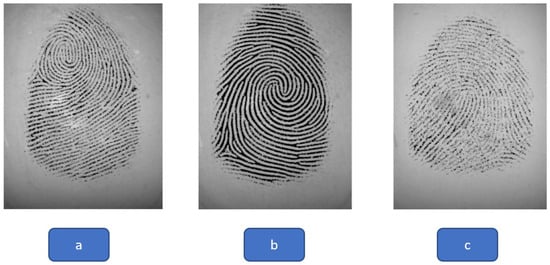 In this study, SFINGE software [52] was utilized to facilitate comparisons with significant and recent works reported in the state of the art [10,13]. In addition, this software generates a substantial database consisting of thousands of fingerprint samples, enabling conclusive observations regarding fingerprint-based individual classification [10,13,51]. SFINGE software produces synthetic fingerprints of different quality levels (low, medium, and high) with a realistic class distribution (unbalanced classes). These synthetic fingerprints generated by SFINGE simulate fingerprints obtained by optical scanners, which are much closer to real systems, such as NIST-4 [53]. Moreover, it is worth noting that the feasibility of adopting the SFINGE database has already been demonstrated in several editions of the FVC [54,55,56,57,58], where it achieved results comparable to those of real fingerprint databases, following the natural class distribution. To emulate various scenarios, three quality profiles were generated using SFINGE: HQNoPert, Default, and VQandPert (see Figure 4). The HQNoPert database consists of high-quality, undisturbed fingerprints. The default database includes fingerprints of medium quality and slight perturbations in localization and rotation. The VQAndPert database comprises fingerprint of varying quality levels, incorporating perturbations related to the location, rotation, and geometric distortions. The primary distinction among the databases lies in the quality of the generated images. In total, 10,000 fingerprints were generated for each quality category, resulting in a comprehensive dataset of 30,000 fingerprints. The generation of 10,000 fingerprints per category ensures a fair and consistent basis for comparison with the studies reported in the state of the art [10,13].
