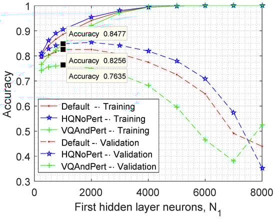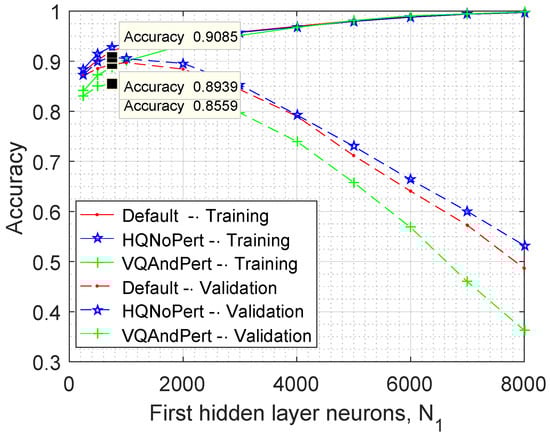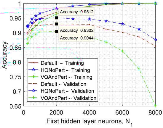 For this study, the sigmoid function (g(x) = 1/[1 (x)]) is considered as the activation function, since it guarantees the universal approximation of the SLFNs, making it suitable for any ELM algorithm dealing with nonlinear problems. In addition, the regularization parameter (C) is omitted across all ELM versions for simplicity. It should be noted that the inclusion of the regularization parameter (C) in the model serves to prevent overfitting by balancing the training error and the norm of the output weights. Hyperparameter optimization for the different ELM models is first performed heuristically with the aim of maximizing their performance while minimizing complexity, thereby avoiding overtraining. This process considers various feature extractors (Capelli02, Hong08, and Liu10) and fingerprint qualities (Default, HQNoPert, and VQAndPert). Figure 5, Figure 6 and Figure 7 illustrate the performance in terms of the number of hidden neurons in the original ELM (single hidden layer), showing results from both the training and validation stages. The training results demonstrate the successful convergence of single-hidden-layer networks trained with the ELM algorithm while highlighting the issue of overfitting that occurs as network complexity (i.e., the number of hidden neurons) increases. The validation results, however, are more indicative of the generalization capacity of the model, since they reflect performance on unseen data. For each descriptor, there is a number of hidden neurons that maximizes the generalization ability of the ELM. This number is only slightly dependent on the fingerprint quality. Nevertheless, for robustness and generalization purposes (so that the results are independent of the fingerprint quality), the following numbers of hidden neurons are adopted: 1000, 2000, and 750 for the Capelli02, Hong08, and Lui10 descriptors, respectively. The accuracies achieved by these numbers of neurons are highlighted with markers. Note that the number of hidden neurons is constrained to 8000 samples, since, theoretically, it has been shown that to achieve the best performance of an ELM, the number of hidden neurons must be less than the number of samples. The following subsection discusses the results regarding fingerprint quality and descriptors in a particular and general manner.