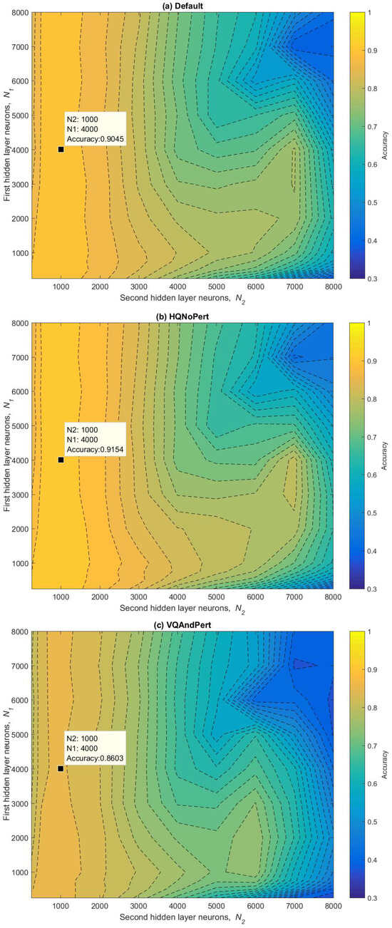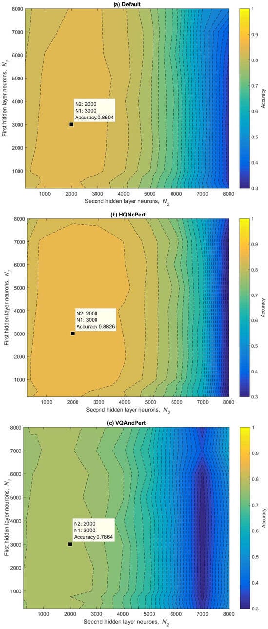 In Figure 8, Figure 9and Figure 10, performance is displayed as contour plots, showing the relationship between the number of neurons in the first and second layers. An irregular zone can be observed where the accuracy reaches its highest value, which is slightly dependent on the quality and, more noticeably, on the descriptor. To avoid overfitting, the optimization yields the following configuration: both the first and second hidden layers contain 1000 neurons ( = = 1000). Increasing the complexity of the ELM (e.g., adding more neurons in each hidden layer) does not necessarily maximize performance, as evidenced by the significant decrease in accuracy when = = 7000. Furthermore, the optimal performance is achieved when the first hidden layer contains more neurons than the second. This is because one of the functions of unsupervised learning in ELM autoencoders is to derive meaningful feature representations at the input level. Thus, simplifying the network architecture in deeper layers is logical to maintain optimal performance.