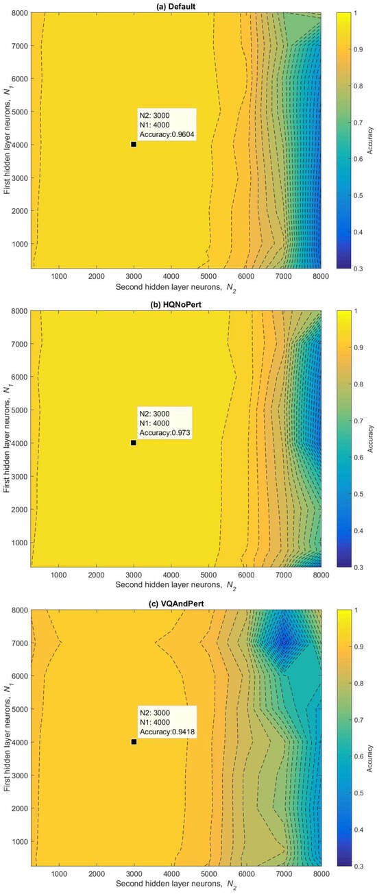 Accuracy as a function of the number of neurons of the two-hidden-layer ELM considering the Liu10 descriptor and the (a) default, (b) HQNoPert, and (c) VQAndPert databases.
