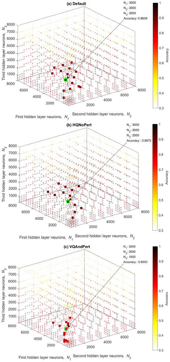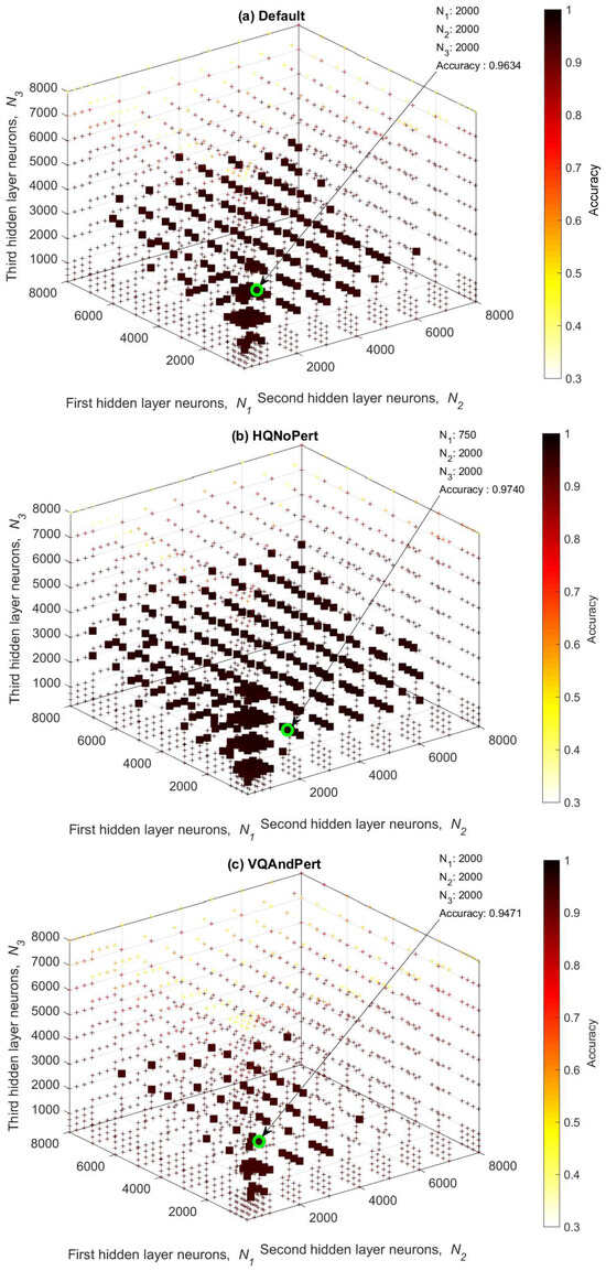 Accuracy as a function of the number of neurons of the three-hidden-layer ELM, taking into account the Liu10 descriptor and the (a) default, (b) HQNoPert, and (c) VQAndPert databases.