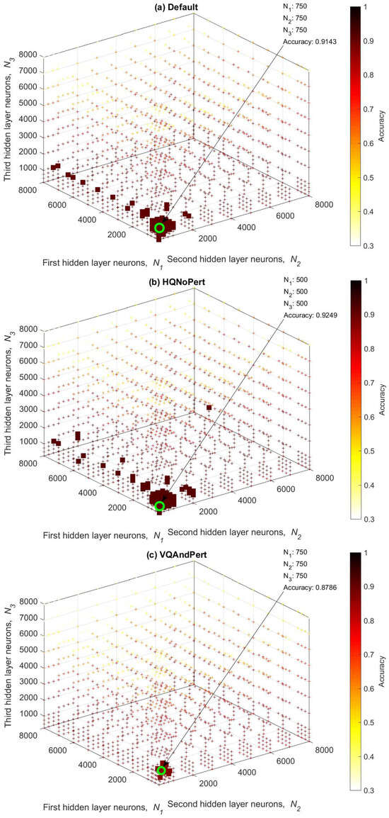 The optimization results for the three-hidden-layer M-ELM model are shown in Figure 11, Figure 12 and Figure 13, where different descriptors and fingerprint qualities are considered to ensure robustness in the findings. The results exhibit a volumetric irregularity in the optimized hidden-node values, with accuracy approaching 1.