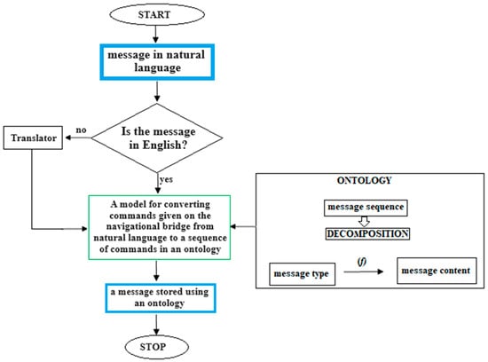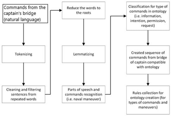 A communication model prototype for the transformation of natural-language messages issued by a ship’s navigator into an ontological form understood by an autonomous system was presented in [1]. It consists of the following nine steps: input in the form of natural-language messages, tokenization, removal of redundant information, transformation of the words to a basic form, lemmatization, part-of-speech recognition, message type classification [12,13,14,15], rule set generation using artificial intelligence, and, finally, output in the form of an ontology [16,17,18,19,20,21,22]. The algorithm of the communication process is shown in Figure 1.