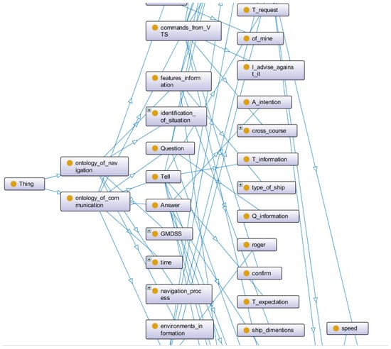 The ontology was built using the Protégé program in English (maritime language required by the STCW Convention). It represents the structure of individual classes, instances, and entities. The communication ontology reflects the real-world processes of acquiring and sharing information and the negotiations carried out between traffic participants. The navigation ontology contains navigational terms, which are its elements for creating messages. To send messages that are unambiguous, each type of message is assigned a category.