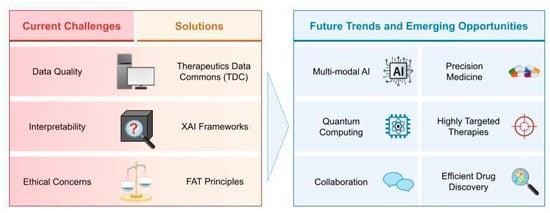 The use of AI in drug discovery raises ethical considerations regarding data privacy, algorithmic biases, and equitable access to AI-driven therapies. Biases in training datasets can lead to inequitable treatment predictions, disproportionately affecting under-represented populations. For instance, in drug repurposing, sex-specific differences in genetics, hormones, and metabolism often result in male- or female-biased drug responses and adverse events. Computational approaches are being developed to identify sex-inclusive drug candidates, improving therapeutic options and reducing adverse effects for all patients [55]. Addressing these concerns, an emerging number of members of the scientific community are applying the FAIR (Findable, Accessible, Interoperable, and Reusable) principles. This approach reduces bias in biomedicine by promoting ethical, transparent, and interoperable data management. Biomedical researchers can access diverse, FAIRified datasets, minimizing bias from localized data [56,57]. In 2021, the FDA received 132 regulatory submissions for drugs that included the use of AI in their discovery and development, resulting in a 10-fold increase over the previous year. This federal agency recognizes the transformative potential of AI in drug development and emphasizes rigorous evaluation through well-controlled clinical studies to ensure that the benefits outweigh the risks. Regulatory oversight requires deep technical expertise to review AI-assisted applications, such as target selection or intervention strategies. Maintaining a workforce with technical expertise is vital to provide timely and effective guidance and support innovation in this evolving field [58]. The European Medicines Agency (EMA) has developed an artificial intelligence (AI) workplan for the European medicines regulatory network to guide the use of AI in medicine regulation in Europe up to 2028 [59]. Regulatory frameworks must evolve to include guidelines for AI in healthcare, ensuring that ethical standards are maintained [60]. By prioritizing ethical considerations, the industry can foster trust and ensure that AI technologies benefit all patients equitably.
