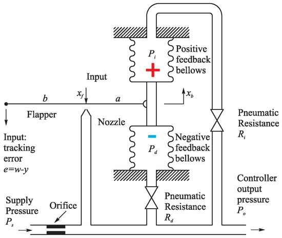 The first of the widely accepted beliefs concerns the use of integral action as one of the pillars of process control. For a long time, controllers were represented by the so-called series PI and PID controllers, which have their origin in a pneumatic controller dating from the beginning of the 20th century until the Second World War [1,2,3]. However, despite the name PI(D), they did not contain any explicit integrators. This is an important aspect that we will discuss in more detail later. At the heart of the pneumatic structure was a flap–nozzle system, which was a high-gain non-linear amplifier initially used for on-off control. By introducing negative feedback through the lower flexible bellows in Figure 1 with a negligible input resistance, the proportional zone was significantly increased and thus the proportional gain was significantly reduced. The transfer function between the controller input and the output became