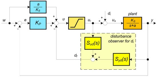 The basic state space controller is then reduced to a proportional (P) controller with the gain (1) [31] (Figure 2). The additional offset generated by a static feed-forward provides a steady-state error of zero for the piecewise constant setpoints w being considered. Using a first-order disturbance model for piecewise constant input disturbances [25,27,32], one has to use the second-order extended state vector reconstructed by an extended state observer (ESO) [31]. Subsequently, the state space design based on the identical state observer introduces use of second-order filters. Thereby, it provides both the reconstruction and stabilization of the process output, as well as the reconstruction and compensation of constant disturbances. The ESO design and the disturbance reconstruction can be simplified to Figure 2 considering just the filtered reconstructed disturbance described by transfer functions