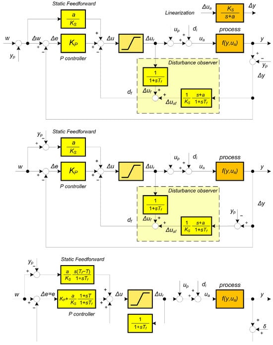 Proportional controller with a static feed-forward and DOB based on linearization of non-linear process (10) around the operating point ) (13) (above), the alternative scheme with shifted summation points (middle), and the implementation using possibly automatic- or hyper-reset controllers augmented with the measurement noise (below).