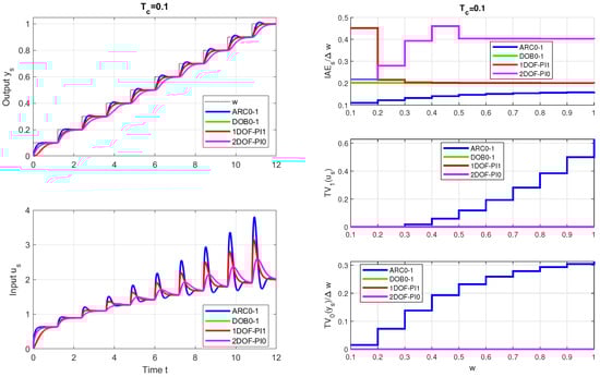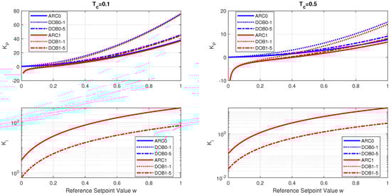 By considering the model with (resulting in a ) and (stabilized with a ) and zero or the first-degree polynomials in the numerator of in (21), it is possible to derive four different controller options. Since the simplest processes prevail in practice, the first-order non-linear processes (10) are considered when testing the above four options for the model-based gain scheduling controllers. The control design options considered are thus the two types of process model in combination with two types of disturbance observer. To distinguish between them, the corresponding controller parameters will be labeled by subscripts, and the transfer functions will be denoted by superscripts. Their first digits 0 and 1 correspond to the ultralocal and local models, respectively. The second subscript, or superscript, denotes the derivative degree (0 or 1) of the DOB numerator transfer function (9).