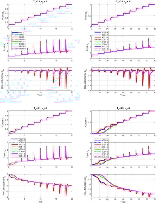 Both the reconstruction of the output disturbance in the IMC framework and the reconstruction of the input disturbance in the MCT and ADRC framework are based on a comparison of the measured process outputs with their expected values obtained using the process model. Similarly, also in the disturbance observer-based control (DOBC) introduced in [33,34,35], the input disturbance can be reconstructed by comparing the output of the controller with the reconstructed input of the process using the inverse process model. As in (9), both signals should be filtered with the same filter. When disturbance observers (DOBs) use the limited control signal, there is no degradation in control performance compared to the undesired integration (windup) of parallel PIDs without proper anti-windup protection. In the nominal case, the addition of reconstruction and disturbance compensation does not change the dynamics of setpoint tracking provided by the stabilizing controller .