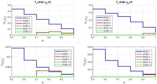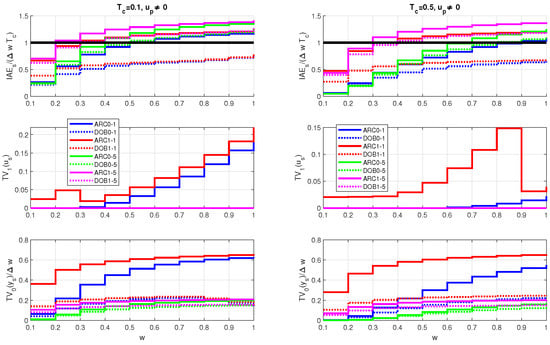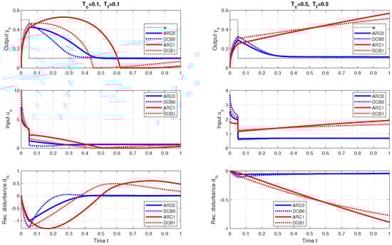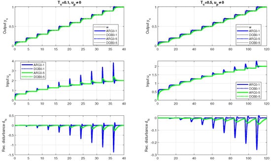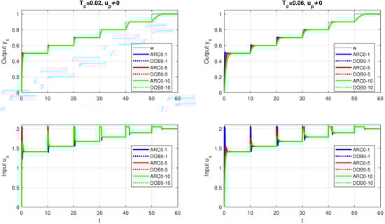 Obviously, for sufficiently long time constants and , the difference between and can be neglected. However, the use of a more complex DOB may no longer make sense. The relationships (52) also mean that the noise attenuation for ARC0 depends on and for DOB0 on and .