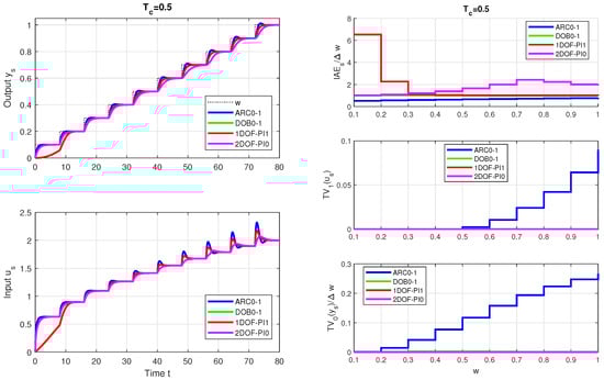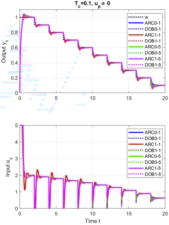 The design of a reduced observer with the value is simpler to explain using the inverse transfer function of the process within the DOBC than in MCT. It also allows for a more flexible choice of with respect to the existing measurement noise. However, it should yet be noted that neither MCT, IMC, nor DOBC mention that the first AR-based controllers used a simplified DOB, which is also effective for non-linear processes with control saturation [16]. This not well-known fact represents one of the main advantages of ARCs compared to heuristic PID controllers. It is not mentioned even in recent publications dealing with DOBC (see, e.g., [48]). On the other hand, when comparing ARCs with DOBC, MTC and ADRC, one should also mention their disadvantage, which is a consequence of using a simplified DOB and which, after introducing disturbance compensation, requires a recalculation of the stabilizing controller. The disturbance compensation in DOBC, MTC, and ADRC in the nominal case does not affect the dynamics of setpoint tracking—it is independent of the setting of the nominal DOB. Therefore, in order to obtain a broader overview of the advantages of individual solutions, it is also important to compare them in the control of non-linear processes. Thereby, the setting of individual linear controllers based on the linearization of the non-linear process around a suitably chosen operating point can usually no longer be considered a nominal case. In this context, another question arises regarding the choice of the linear model used: “local” with in a process linearization (8), or “ultralocal” model with ? Similarly, one can ask about the sensitivity of particular solutions to measurement noise [5]. By choosing the simplest option in (9) with the model parameters and , and considering zero- or first-order polynomials in the numerator of in (9) that produce ARCs, or DOBs, it is possible to introduce and examine four different options for controller design (see Figure 2). Both the local () and the ultralocal () model can be used for the following: