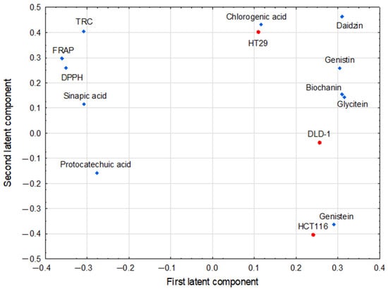 Partial least squares model loadings (first and second latent components in PLS). The model correlated the predictive parameters (biochanin, chlorogenic acid, daidzin, genistein, genistin, glycitein, protocatechuic acid, synapinic acid, DPPH, FRAP, TRC; depicted as blue diamonds) and response ones (cell viability tested in cell lines: DLD-1, HCT116, HT29; depicted as red dots).