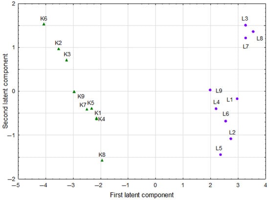 The projection of kale (K1…K8) and lupine (L1…L8) sprouts into the space defined by first two latent components of partial least squares model.