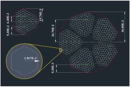 Five-segment cable cross-section (2D view) used for extruding 3D cables. Each segment is treated as a solid bundle of hexagonally packed strands. All dimensions are in meters.