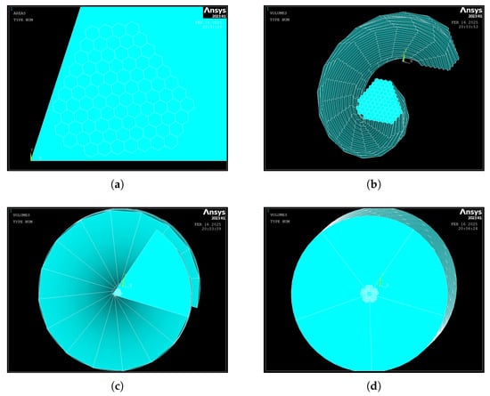 A consistent 2D cross-section, containing five distinct segmented bundles as shown in Figure 1, is imported into ANSYS Mechanical APDL as an IGES file. Each segment uses hexagonally packed sub-strands. The cross-section area for each segment is identical across all lay-length models; only the helix pitch changes how the segment is swept along z.