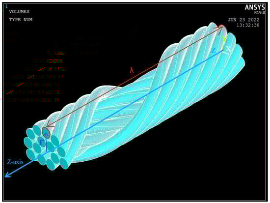 The 2D cross-sectional areas for one-fifth of the cable (Figure 4a) are first imported in IGES format. Then, by adjusting the lay length parameter in the APDL batch script (LayLength), the same 2D model is extruded and replicated at varying pitches to produce different twisted geometries. Below is an excerpt of the APDL code to create the volumes:
