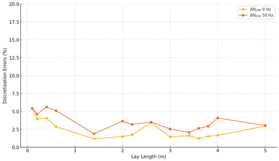 Discretization errors occur when continuous electromagnetic fields are approximated using finite-element meshes. These errors are influenced by the mesh density and refinement, especially in regions with steep field gradients, such as near conductors and insulation layers. Adaptive meshing mitigates these errors by prioritizing critical regions, enhancing accuracy without significantly increasing computational demands. In ANSYS, the EMAGERR macro is commonly used to compute maximum discretization error norms, providing error estimates for electromagnetic field quantities like magnetic flux density (B). The represents a normalized metric indicating the discrepancy in flux density (B) values. Table 2 and Figure 6 shows error values for each of the 14 twisted models at 0 Hz and 50 Hz.