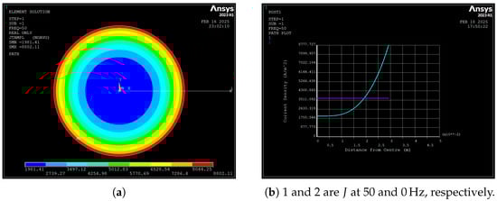 In Figure 7b, the light blue curve shows the current density in the solid round conductor under AC excitation at 50 Hz, plotted against the radial distance from the center. This profile highlights the skin effect, which forces the current toward the conductor’s outer periphery. By contrast, the purple horizontal line corresponds to the uniform current density that would be observed under DC conditions, where neither skin nor proximity effects distort the current distribution.