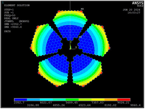 The second 2D model replicates the five-segment cross-sectional geometry used for the 3D simulations but with no helical twist, meaning that the sub-conductors remain perfectly parallel. This configuration represents the limiting case of a 3D cable with an infinite lay length. Under AC conditions at 50 Hz, both skin and proximity effects are present. The resulting current–density distribution shows enhanced non-uniformity near the outer layer of the cable as presented in Figure 8.