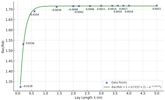 This section first analyzes the DC (0 Hz) results, confirming that irrespective of lay length. We then examine the 50 Hz outcomes, noting that and systematically increases with growing . Finally, an exponential-saturation curve is fitted to the 50 Hz results, and key physical interpretations are discussed.