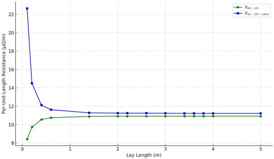 While the effective AC resistance per meter which is normalized by , decreases for shorter lay lengths (), the actual AC resistance per meter of the cable, denoted , can still be larger. The key distinction is that smaller values create a more tightly wound helix, increasing the actual conductor path length within the same longitudinal distance. This tighter twist adds more conductor material to the total circuit, so charges must traverse a physically longer route—therefore incurring a higher total resistance. In other words, even if the per-unit-length resistance is reduced by improved current distribution (skin/proximity mitigation), the added conductor length can outweigh that benefit, leading to a greater overall ohmic loss for the entire longitudinal length of the cable. This relation is clearly visible in Figure 10.