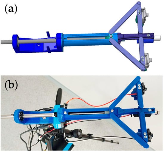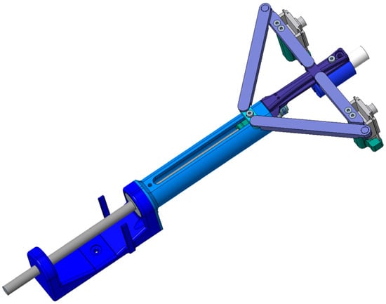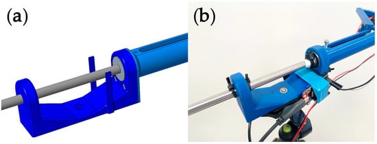 A component with a guide groove is attached to the base part with two screws to guide the movement and prevent rotation of the linear bearing. This can be seen in Figure 3. A lightweight, plastic linear-bearing RJ4JP-01-08 LM8UU was placed on the guide rod, and the use of a plastic bearing without a ball system allows not only the displacement of the bearing but also the rotation of the guide rod to be performed almost without resistance. A hole for an M3 bolt was drilled on the linear bearing in the middle of its length in the normal direction to the axis. This bolt is used to attach the arm bracket. PTFE Teflon tape is wound on the arm holder. This reduces friction between the holder and the guide groove and compensates for the unevenness caused by the production of physical models by FFF technology.