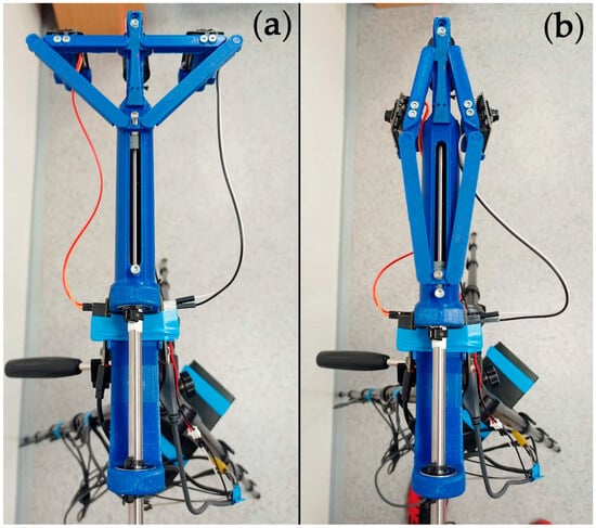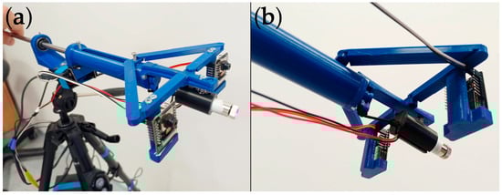 Representation of the mechanism movement of the prototype device. (a) First device position during calibration and digitizing. (b) Second position of the device for insertion into confined spaces.