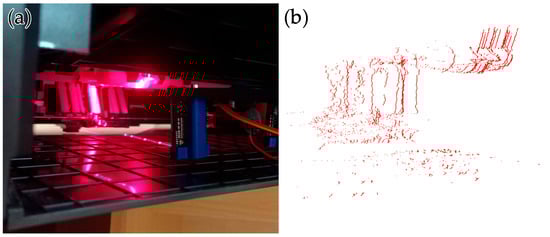 Experimental verification of the functionality of the prototype digitization device was subsequently required. The prototype digitization device was verified while digitizing the surface in confined spaces. For verifying the functionality in hard-to-reach areas, the digitizing printer paper slider was chosen. As can be observed in Figure 7a, the printer surface is black and glossy, and digitizing these surfaces is difficult, even when digitizing with industrial scanners, and often requires the application of a matte coating to the digitized surface. The prototype digitizing equipment was calibrated and then placed in the confined space of the printer’s paper feeder. Subsequently, surface digitization was performed. Despite the challenging surface for digitizing, the device was able to register the laser pattern projected on the surface, as can be observed in Figure 7b. The detail of the point cloud obtained by the prototype digitizing device depends on the number of individual scans performed.