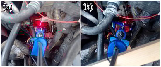 To verify the functionality of the prototype digitizing device, digitizing was performed in the engine compartment of the automobile in Figure 8. It is not possible to perform surface scanning in this area with conventional scanners because this area is dimensionally confined, and access is prevented by hoses and other components. Therefore, this space can be considered suitable for verifying the functionality of the prototype digitization device. After the calibration of the device was carried out freely in the area in front of the automobile, the device was adjusted to the position with the cameras folded down and inserted into the engine compartment. The actual insertion of the prototype digitizing device into this compartment was considerably challenging, as it was necessary to carefully insert the device into the compartment through hoses and other components, being careful to avoid unwanted collisions of the device with these components. With a strong impact or application of force, it would be possible to damage the ESP32-CAM equipment or the components of the equipment mechanism itself. Subsequently, the device was adjusted into position by the user during calibration by moving the arm holder to the front end position. Subsequently, a wooden bracket was attached to the motor section, and the device was secured to it with plastic tie wraps to prevent it from sliding.