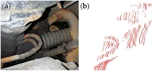 Digitizing the engine compartment of an automobile. (a) Picture of the automobile engine compartment. (b) Resultant point cloud.