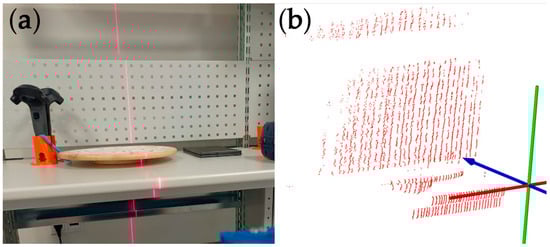 Digitization of the workplace with prototype digitization device. (a) Picture of the workplace. (b) Resultant point cloud.