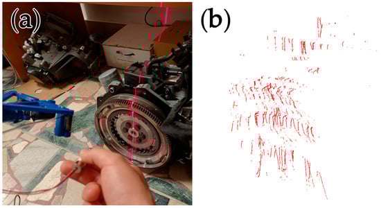 Digitization of an automobile engine part. (a) Picture of pointing laser line by hand. (b) Resultant point cloud.